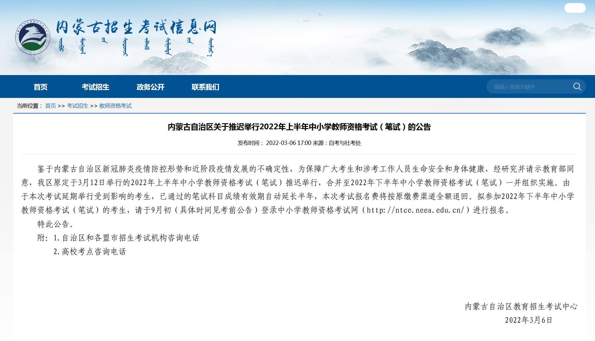 據(jù)內(nèi)蒙古招生考試信息網(wǎng)消息,3月6日,內(nèi)蒙古自治區(qū)教育招生考試中心發(fā)布公告稱,鑒于內(nèi)蒙古自治區(qū)新冠肺炎疫情防控形勢(shì)和近階段疫情發(fā)展的不確定性,為保障廣大考生和涉考工作人員生命安全和身體健康,經(jīng)研究并請(qǐng)示教育部同意,原定于3月12日舉行的2022年上半年中小學(xué)教師資格考試(筆試)推遲舉行,合并至2022年下半年中小學(xué)教師資格考試(筆試)一并組織實(shí)施。由于本次考試延期舉行受到影響的考生,已通過的筆試科目成績有效期自動(dòng)延長半年,本次考試報(bào)名費(fèi)將按原繳費(fèi)渠道全額退回。
