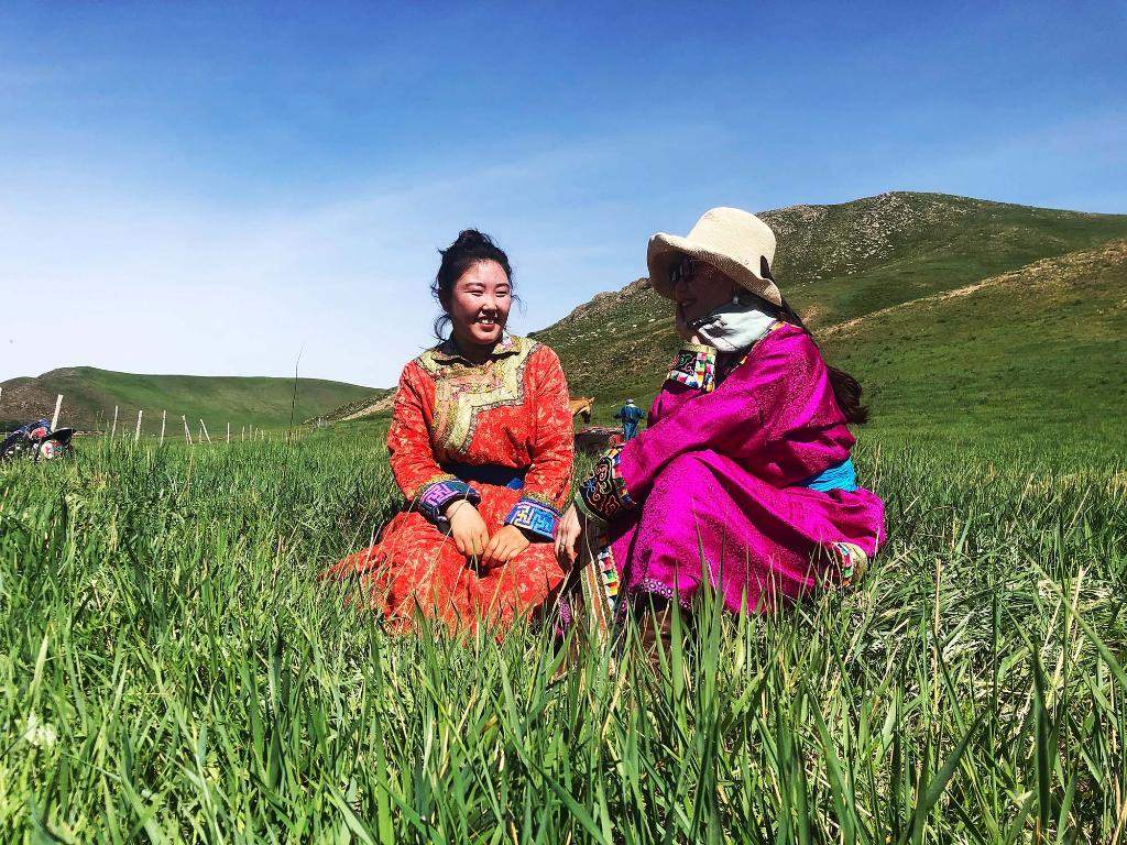 哈斯薩日嘎(左)與游客在草原上聊天。圖片由受訪(fǎng)者提供
