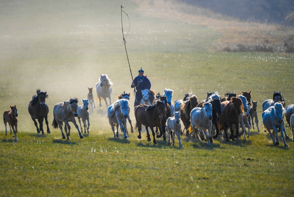 內(nèi)蒙古錫林郭勒盟西烏珠穆沁旗的牧民在驅(qū)趕馬群(5月17日攝)。新華社記者彭源攝