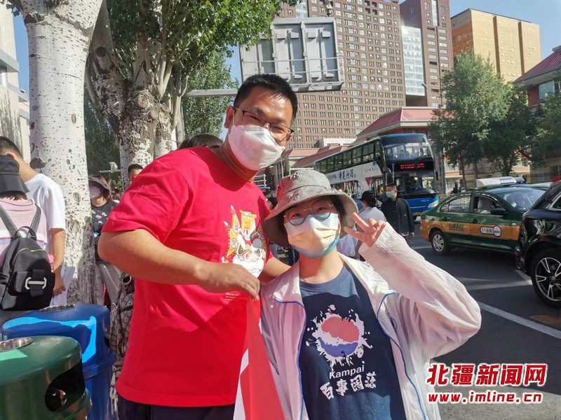 呼和浩特市實驗中學(xué)察哈爾校區(qū)的送考教師身穿旗開得勝的紅色T恤,戴印有“金榜題名”的紅色口罩為學(xué)生加油助威,并祝愿所有考生“凌云壯志展宏圖 錦繡前程幸福路”。