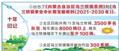 黨的十八大以來(lái),烏蘭牧騎事業(yè)發(fā)展進(jìn)入快車道。自治區(qū)制定了一系列加快推進(jìn)烏蘭牧騎事業(yè)發(fā)展的政策,出臺(tái)了《內(nèi)蒙古自治區(qū)烏蘭牧騎條例》和《烏蘭牧騎事業(yè)中長(zhǎng)期發(fā)展規(guī)劃(2021-2030年)》。設(shè)立全區(qū)烏蘭牧騎事業(yè)發(fā)展專項(xiàng)經(jīng)費(fèi),為75支烏蘭牧騎配備演出大巴車,新建烏蘭牧騎宮,舉辦烏蘭牧騎藝術(shù)節(jié)、全區(qū)烏蘭牧騎新人新作比賽,開展全區(qū)烏蘭牧騎交流演出、“烏蘭牧騎月”等活動(dòng),促進(jìn)烏蘭牧騎互相學(xué)習(xí)發(fā)展。開發(fā)“網(wǎng)上烏蘭牧騎”PC版網(wǎng)頁(yè)和手機(jī)版微信H5,成立烏蘭牧騎輔導(dǎo)工作隊(duì)、志愿服務(wù)工作隊(duì),為基層農(nóng)牧民提供藝術(shù)培訓(xùn)服務(wù)。以“烏蘭牧騎+”的方式深入基層,開展理論宣講、電影放映、法律咨詢等綜合志愿服務(wù)。加強(qiáng)烏蘭牧騎人才隊(duì)伍建設(shè),在錫林郭勒職業(yè)學(xué)院等設(shè)立烏蘭牧騎人才培訓(xùn)基地,舉辦全區(qū)烏蘭牧騎隊(duì)長(zhǎng)培訓(xùn)班、舞臺(tái)藝術(shù)創(chuàng)作培訓(xùn)班等業(yè)務(wù)培訓(xùn)班。組織實(shí)施《烏蘭牧騎原創(chuàng)經(jīng)典作品名錄》工作和《全區(qū)烏蘭牧騎原創(chuàng)經(jīng)典作品傳承工程》。編輯出版《烏蘭牧騎回憶錄》《烏蘭牧騎優(yōu)秀作品選》。組織啟動(dòng)烏蘭牧騎知識(shí)產(chǎn)權(quán)保護(hù)工作。