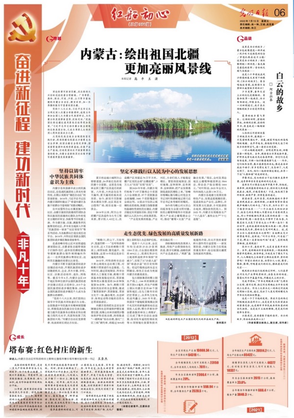 7月15日,《光明日?qǐng)?bào)》6版刊發(fā)《奮進(jìn)新征程建功新時(shí)代·非凡十年|內(nèi)蒙古:繪出祖國(guó)北疆更加亮麗風(fēng)景線(xiàn)》,全文如下: