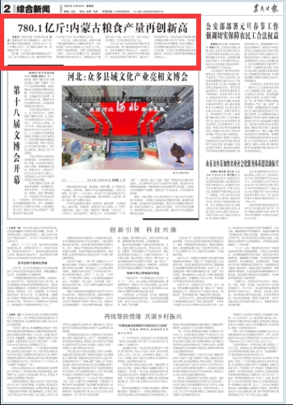 12月29日,《農(nóng)民日報》2版刊發(fā)《780.1億斤!內(nèi)蒙古糧食產(chǎn)量再創(chuàng)新高》,報道2022年內(nèi)蒙古糧食產(chǎn)量實現(xiàn)“十九連豐”,再創(chuàng)新高!