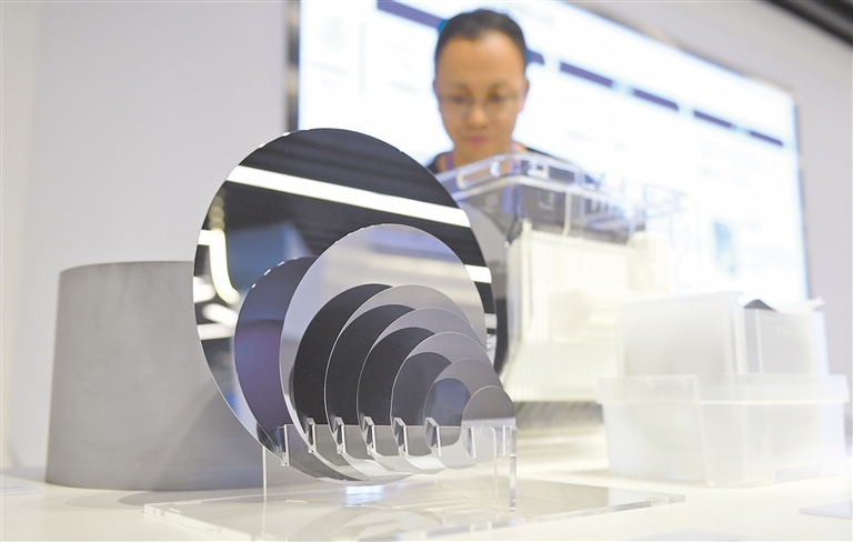 中環(huán)產(chǎn)業(yè)園展廳,工作人員介紹2-12英寸硅拋光片。