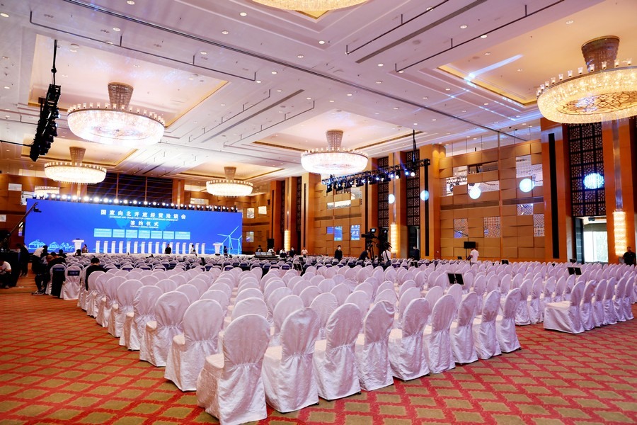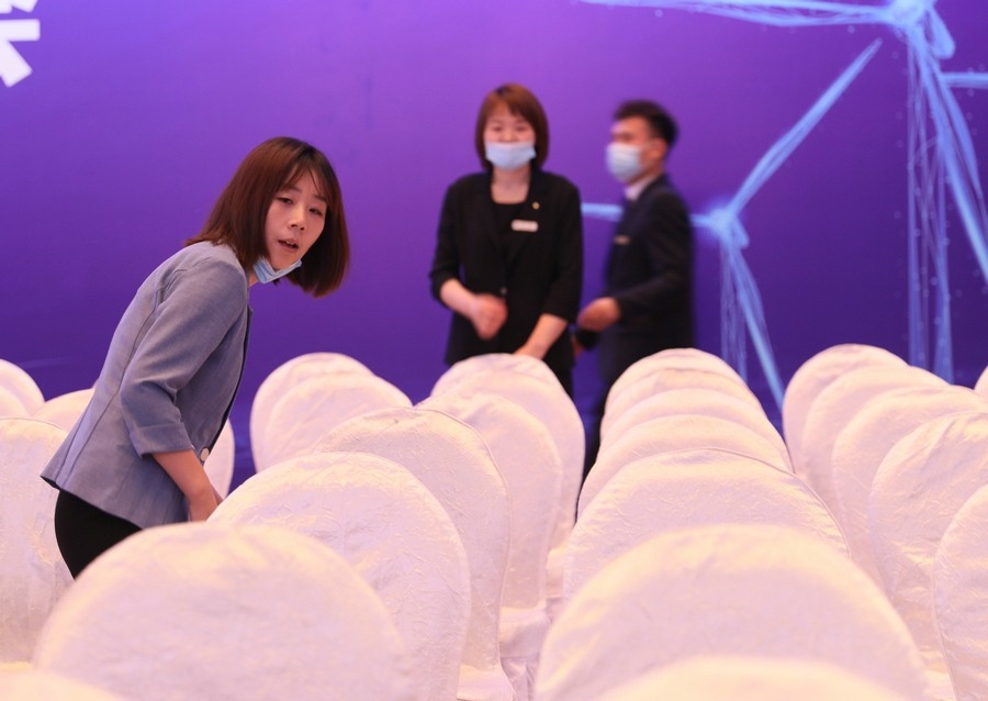 會場基本布置完畢,工作人員正在進(jìn)行流程彩排