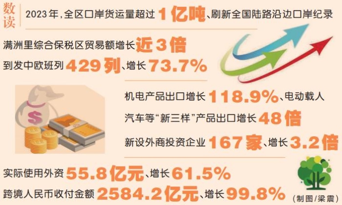 2023年,全區(qū)口岸貨運(yùn)量超過(guò)1億噸、刷新全國(guó)陸路沿邊口岸紀(jì)錄;滿(mǎn)洲里綜合保稅區(qū)貿(mào)易額增長(zhǎng)近3倍;到發(fā)中歐班列429列、增長(zhǎng)73.7%;機(jī)電產(chǎn)品出口增長(zhǎng)118.9%、電動(dòng)載人汽車(chē)等“新三樣”產(chǎn)品出口增長(zhǎng)48倍;新設(shè)外商投資企業(yè)167家、增長(zhǎng)3.2倍;實(shí)際使用外資55.8億元、增長(zhǎng)61.5%;跨境人民幣收付金額2584.2億元、增長(zhǎng)99.8%……
