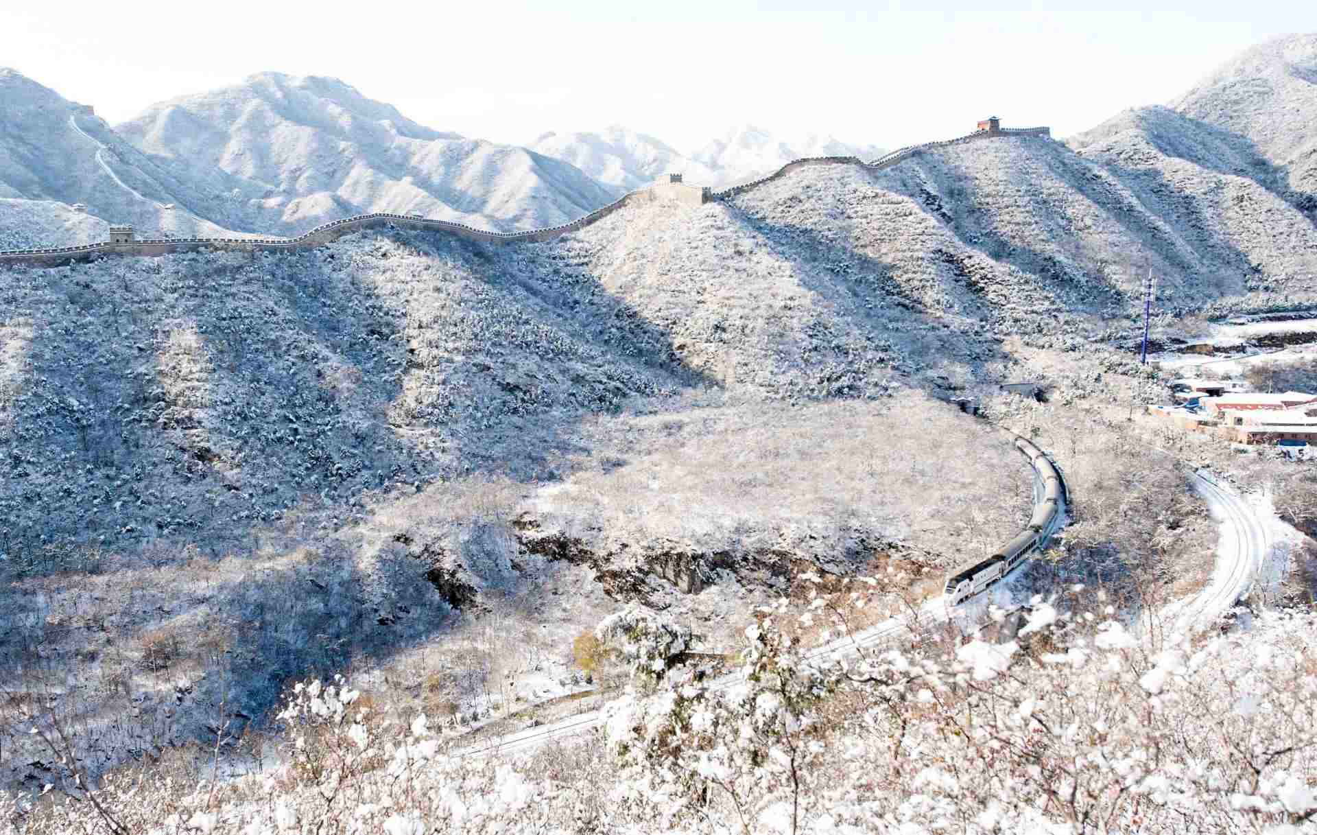 白雪皚皚,北京居庸關(guān)長(zhǎng)城銀裝素裹綿延于山脊之上。山腳下,S2線列車迎面而來(lái)穿越雪海。