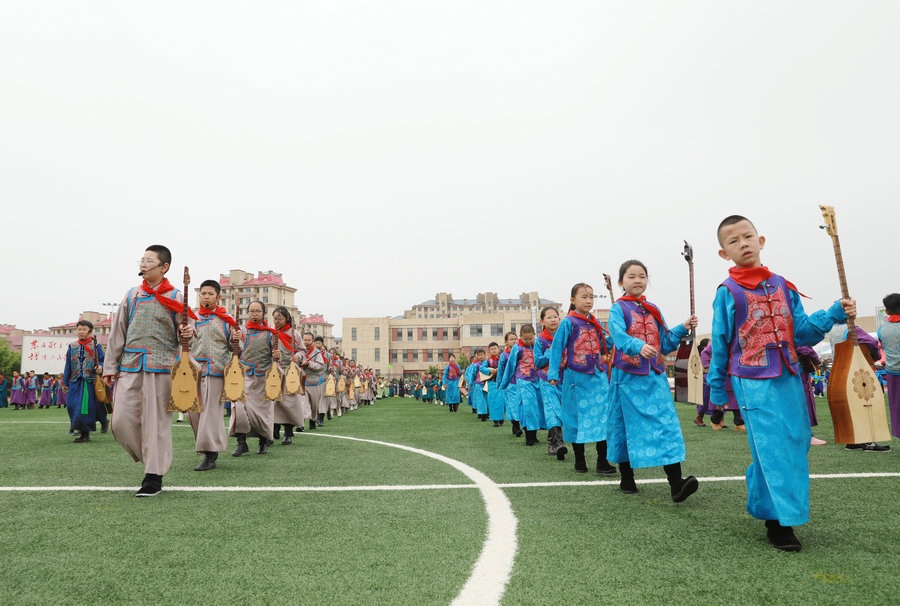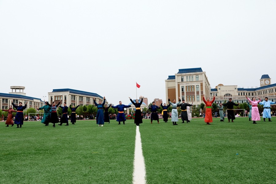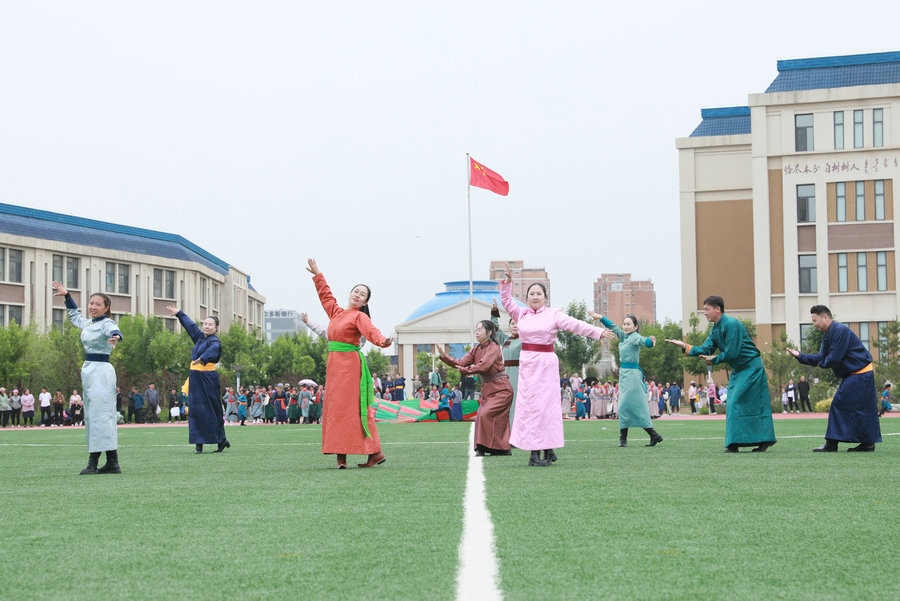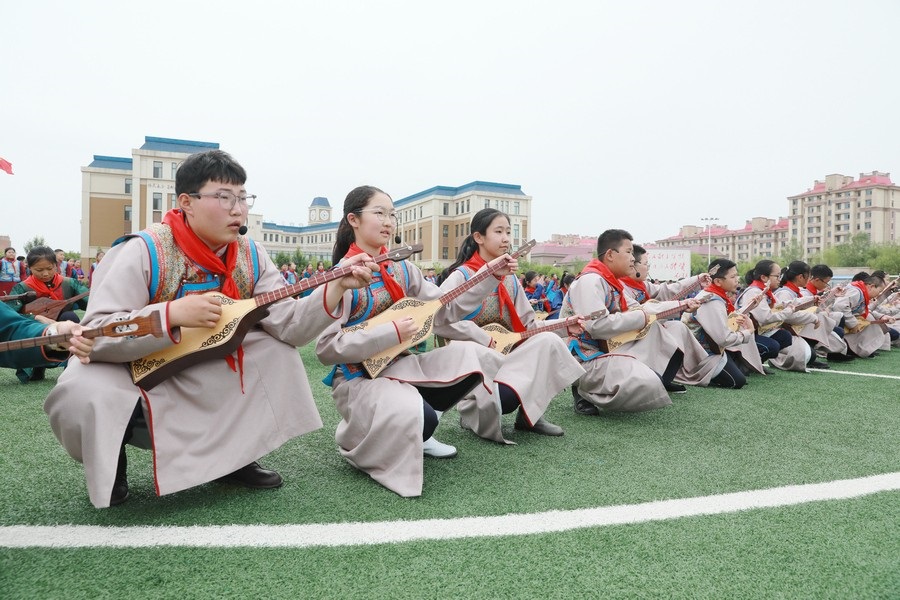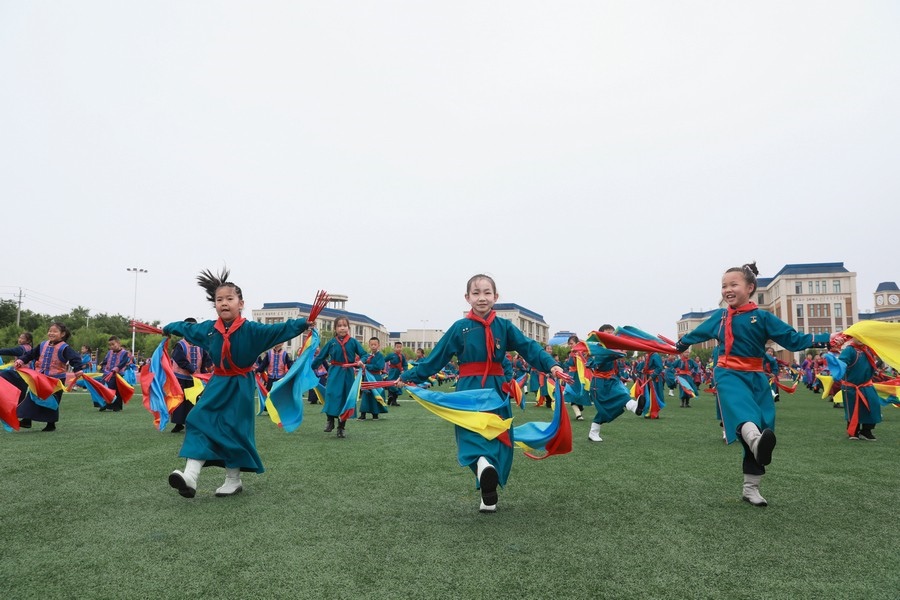 北疆新聞鄂爾多斯5月29日電(記者 張楊)“我們以鑄牢中華民族共同體意識為主線,創(chuàng)建了4個‘千人文化’特色課程,分別為千人足球、千人《江格爾》、千人筷子舞、千人棋類?!?月29日,內(nèi)蒙古鄂爾多斯鄂托克前旗“美育潤心·筑夢同行”第十四屆中小學(xué)師生藝術(shù)節(jié)暨慶“六一”國際兒童節(jié)多彩大課間操展示活動,在鄂托克前旗第一小學(xué)舉行。該校校長阿拉騰達(dá)來接受記者采訪時表示,創(chuàng)建這個特色課程的主要目的,是培養(yǎng)孩子多方面的才藝,為祖國培養(yǎng)有用之才。