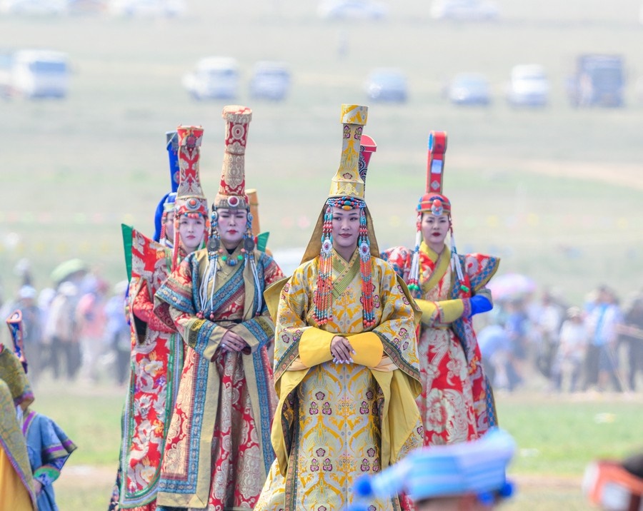在16名國(guó)家級(jí)非物質(zhì)文化遺產(chǎn)項(xiàng)目朝爾道傳承人和聲演唱《初升的太陽(yáng)》的曲目中,拉開了本屆草原那達(dá)慕的序幕。200余名身著盛裝的牧民群眾手捧哈達(dá)誠(chéng)迎八方賓朋,深情表達(dá)對(duì)盛世華誕、風(fēng)調(diào)雨順、國(guó)泰民安的美好祝愿。