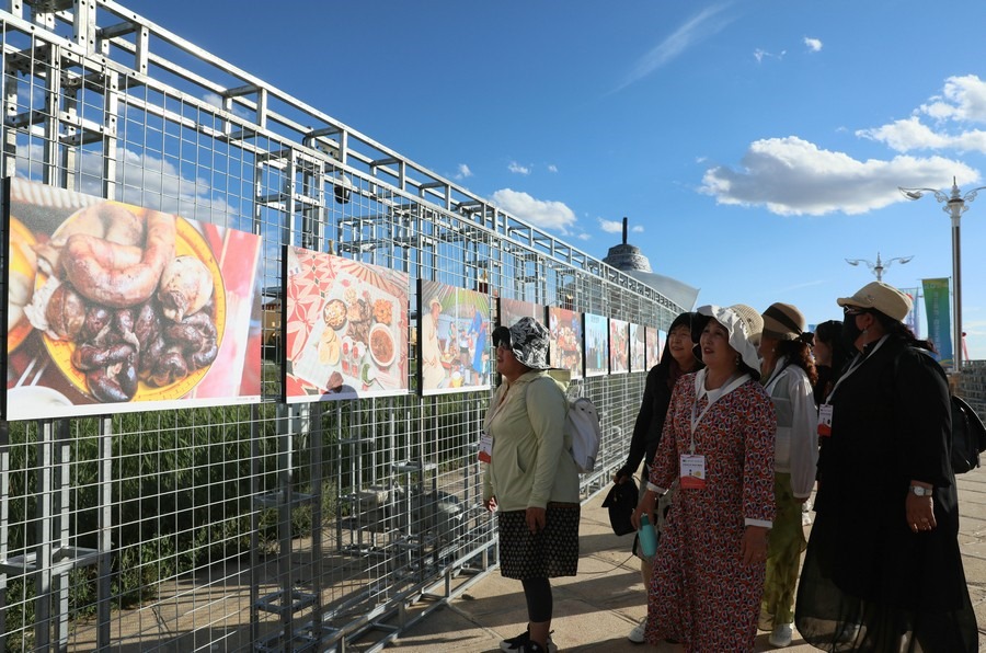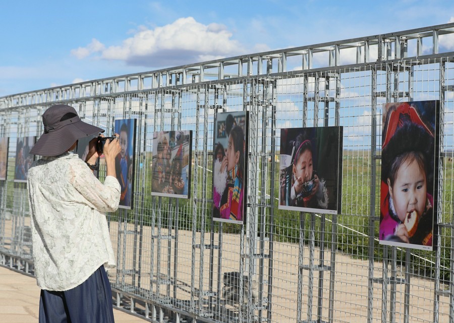 7月28日,第14屆《食色世界》攝影大展,在四子王旗格根塔拉草原旅游中心開展。圖為游客正在拍攝攝影作品。