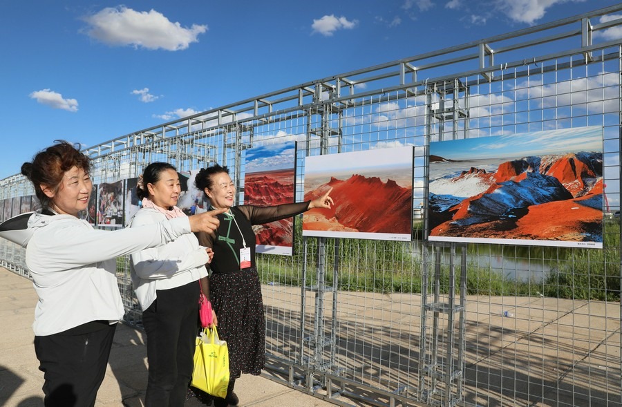 7月28日,第14屆《食色世界》攝影大展,在四子王旗格根塔拉草原旅游中心開展。圖為游客正在參觀攝影展。