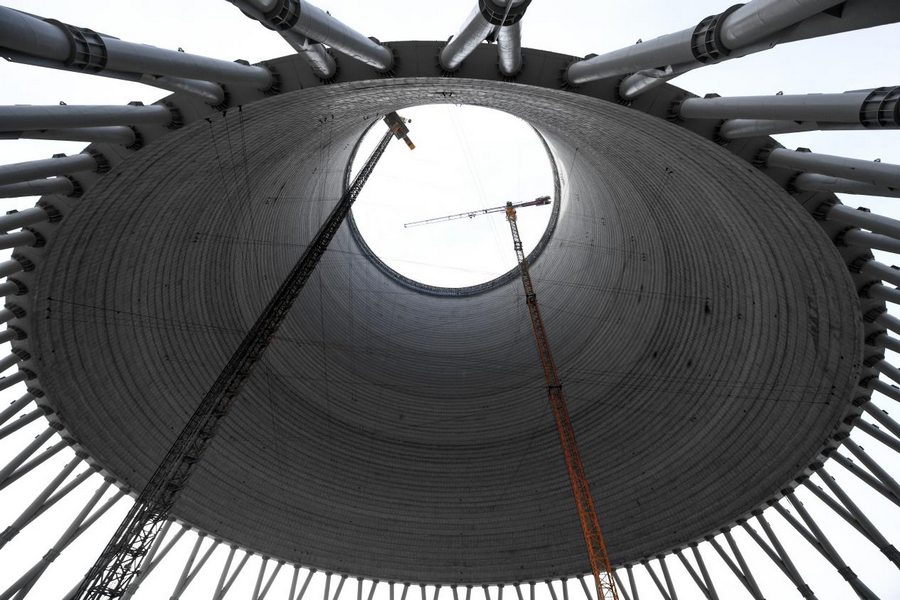 12月6日,在內(nèi)蒙古呼和浩特市土默特左旗內(nèi)蒙古能源集團(tuán)金山熱電三期項目建設(shè)現(xiàn)場,工人們正有序進(jìn)行著設(shè)備安裝等工作。進(jìn)入該項目間冷塔內(nèi)部,抬頭仰望,仿佛一只巨大的眼睛凝視,未來該項目投產(chǎn)后可實現(xiàn)年發(fā)電量100億千瓦時,新增供熱面積5000萬平方米,將溫暖送至千家萬戶。(楊鑫 攝)