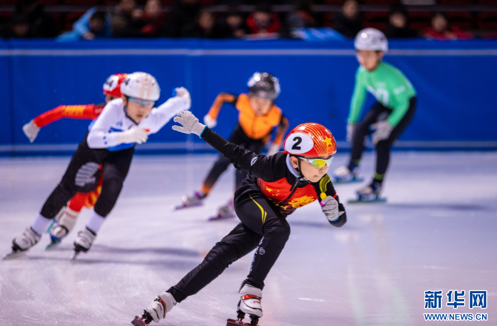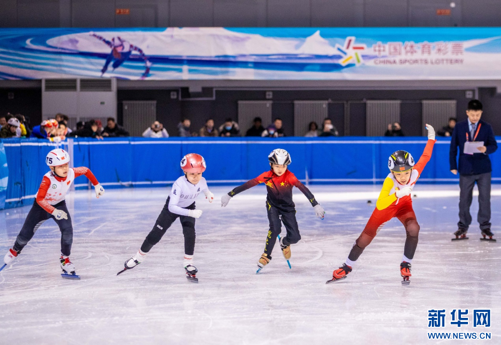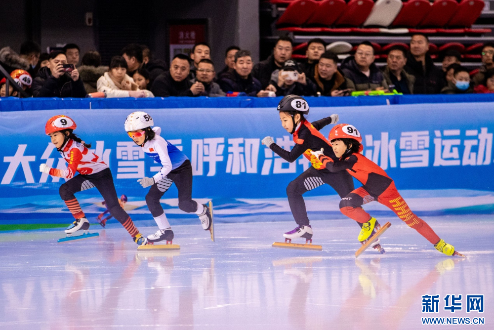 ??12月15日,參賽小選手在呼和浩特市冰雪運(yùn)動系列活動短道速滑公開賽比賽中。新華網(wǎng)發(fā)(丁根厚 攝)