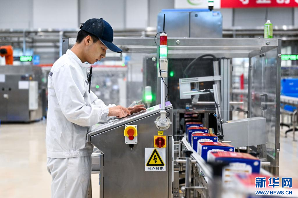 1月9日,在呼和浩特市伊利現(xiàn)代智慧健康谷液態(tài)奶全球智造標(biāo)桿基地,工人在生產(chǎn)線上操作設(shè)備。