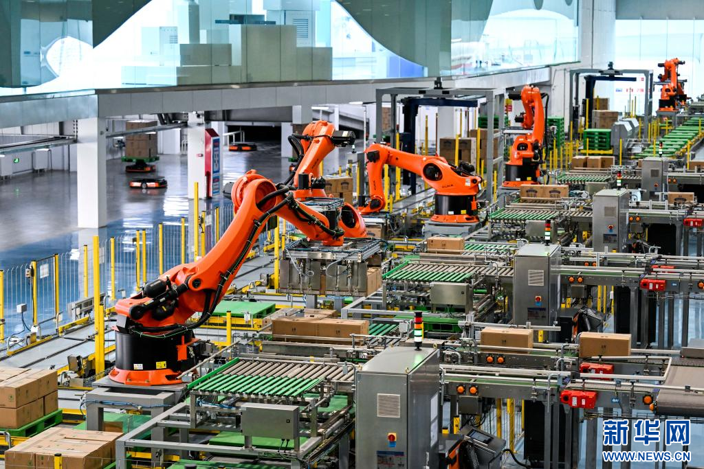 1月9日,在呼和浩特市伊利現(xiàn)代智慧健康谷液態(tài)奶全球智造標(biāo)桿基地,機械臂在碼放裝箱的奶制品。