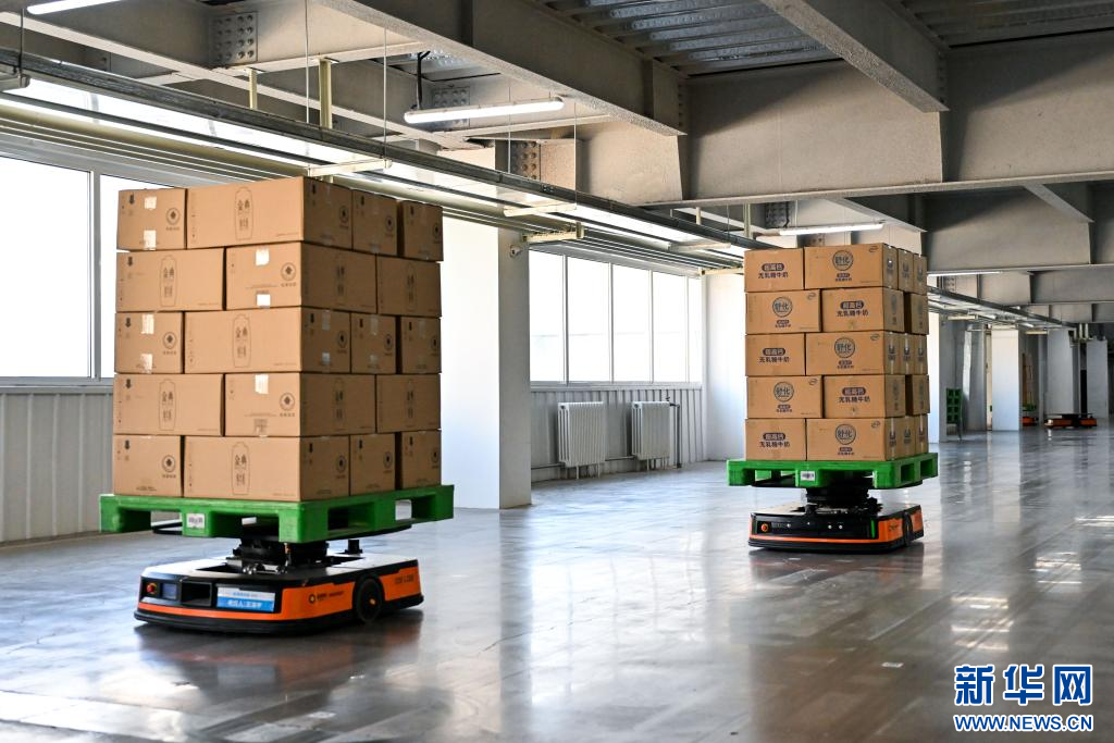 1月9日,在呼和浩特市伊利現(xiàn)代智慧健康谷液態(tài)奶全球智造標(biāo)桿基地,AGV智能搬運機器人在運送奶制品。