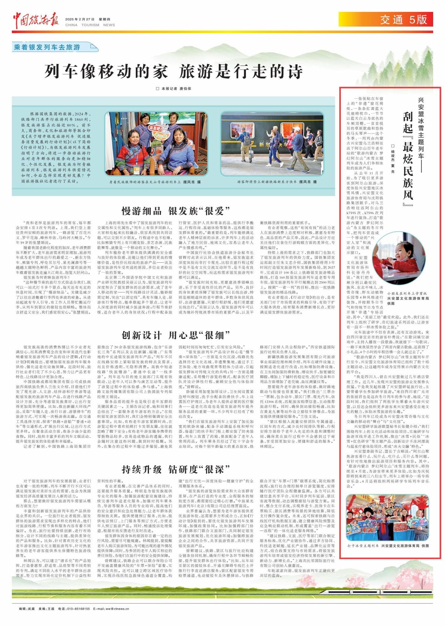 2025年2月27日,《中國旅游報(bào)》第5版刊發(fā)題為《興安盟冰雪主題列車——刮起“最炫民族風(fēng)”》的文章,報(bào)道了一列列由內(nèi)蒙古興安盟烏蘭浩特往返于阿爾山百年老車站的“歌游內(nèi)蒙古 夢幻阿爾山”冰雪主題列車成為人們爭相體驗(yàn)的旅游產(chǎn)品。