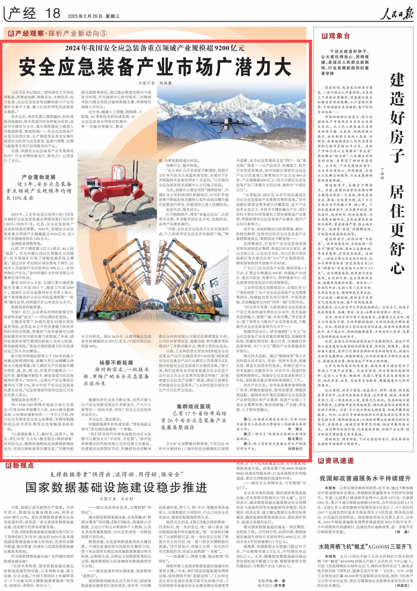 2025年2月26日,《人民日報》第18版刊發(fā)題為《2024年我國安全應急裝備重點領域產(chǎn)業(yè)規(guī)模超9200億元 安全應急裝備產(chǎn)業(yè)市場廣潛力大》的報道,2024年,我國安全應急裝備重點領域產(chǎn)業(yè)規(guī)模超過9200億元,其中,內(nèi)蒙古自治區(qū)紅慶梁煤礦實現(xiàn)了智能監(jiān)測系統(tǒng)全覆蓋。