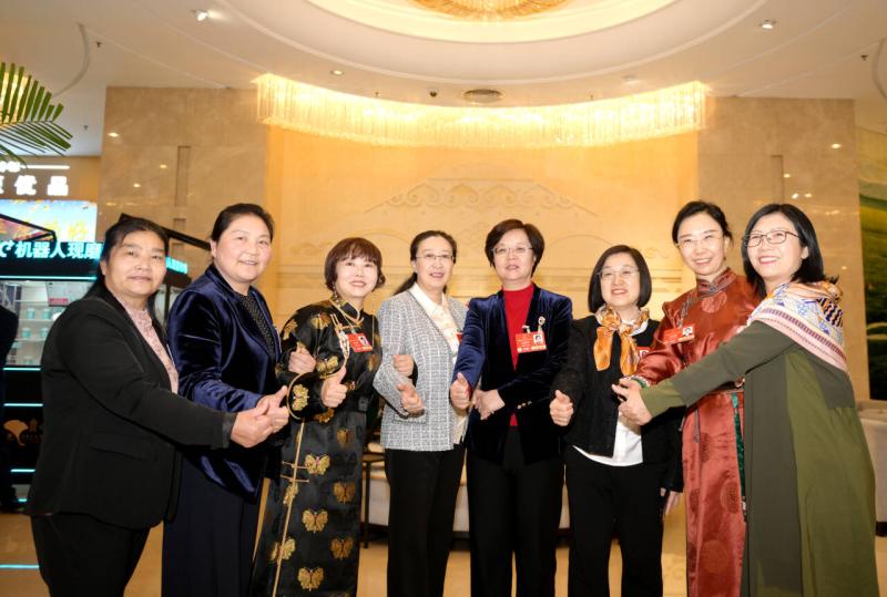 3月7日,參加十四屆全國人大三次會(huì)議的內(nèi)蒙古代表團(tuán)的部分女代表們?cè)隈v地合影,迎接即將到來的三八婦女節(jié),表達(dá)了對(duì)全國女性的美好祝愿。記者 馬建兵 攝