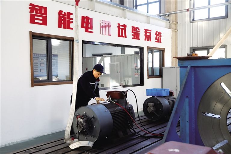 內(nèi)蒙古優(yōu)普森電氣有限公司生產(chǎn)車(chē)間內(nèi)一臺(tái)永磁電機(jī)正在進(jìn)行出廠前試驗(yàn)。 記者 劉向平 攝