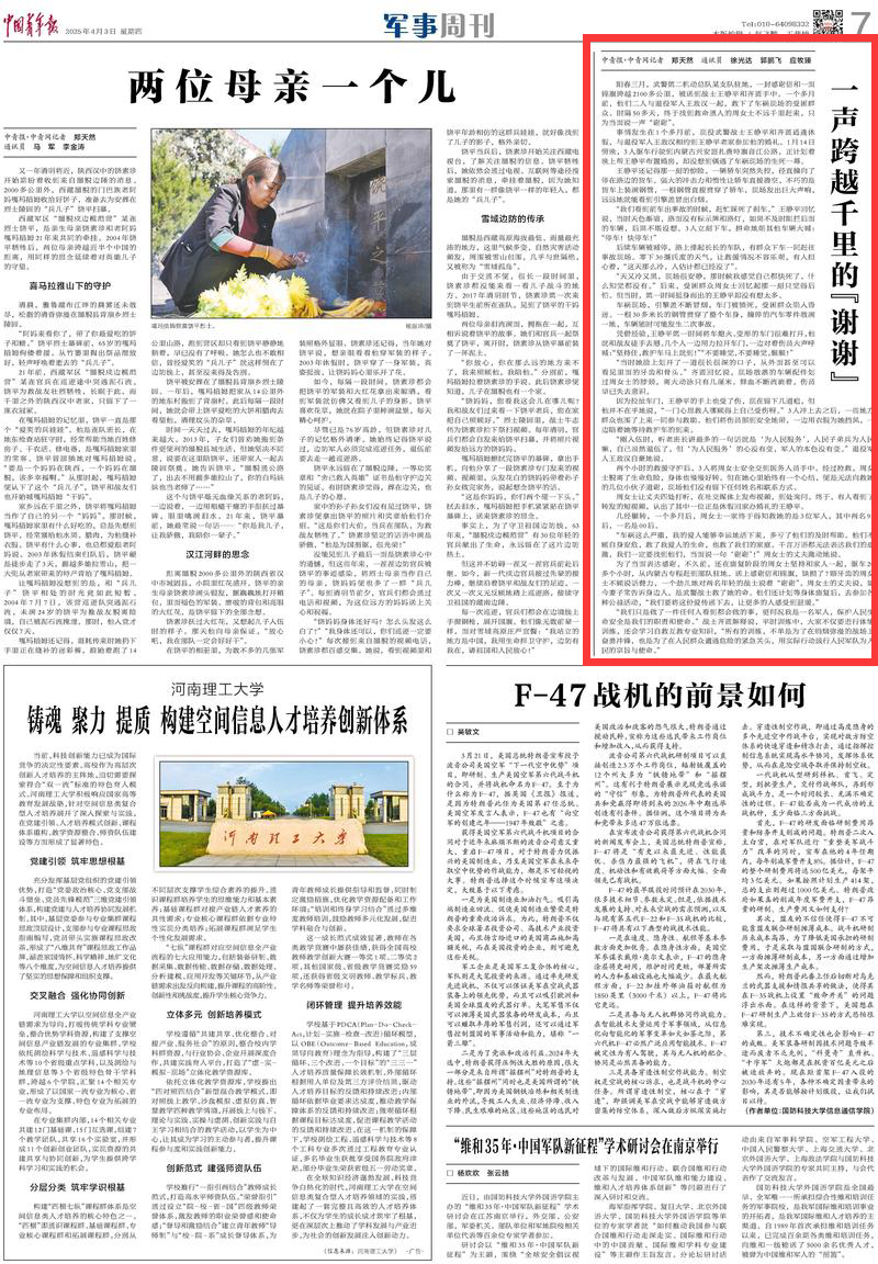 2025年4月3日,《中國青年報(bào)》第7版刊發(fā)題為《一聲跨越千里的“謝謝”》一文,報(bào)道了武警第二機(jī)動(dòng)總隊(duì)某支隊(duì)駐地戰(zhàn)士王靜平和齊圓,收到跨越2100多公里的一封感謝信和一面錦旗。原來,一個(gè)多月前,他們二人與退役軍人王政漢一起,在內(nèi)蒙古興安盟扎賚特旗救下了車禍現(xiàn)場的受困群眾。時(shí)隔50多天,終于找到救命恩人的周女士不遠(yuǎn)千里趕來,只為當(dāng)面說一聲“謝謝”。