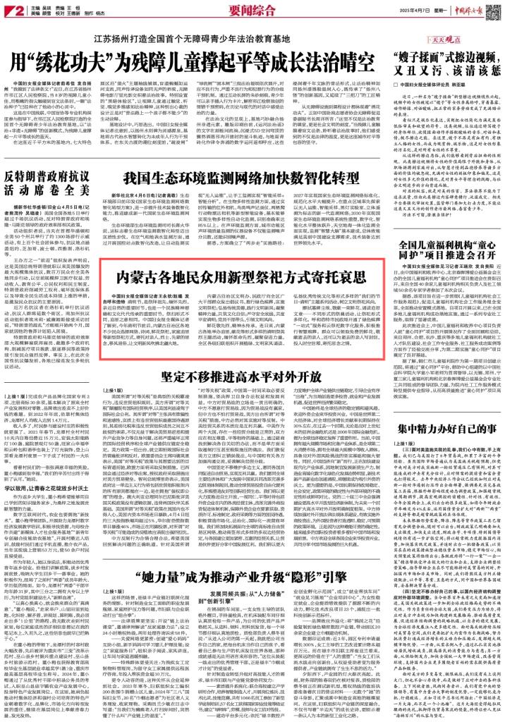 2025年4月7日,《中國(guó)婦女報(bào)》第2版刊發(fā)題為《內(nèi)蒙古各地民眾用新型祭祀方式寄托哀思》的稿件,報(bào)道了今年清明節(jié)前后,內(nèi)蒙古自治區(qū)各地不少民眾選擇網(wǎng)絡(luò)、詩(shī)詞、鮮花祭祀,家庭追思等新型祭祀方式,寄托對(duì)親人、烈士、先輩的思念,移風(fēng)易俗,文明新風(fēng)吹拂北疆大地。