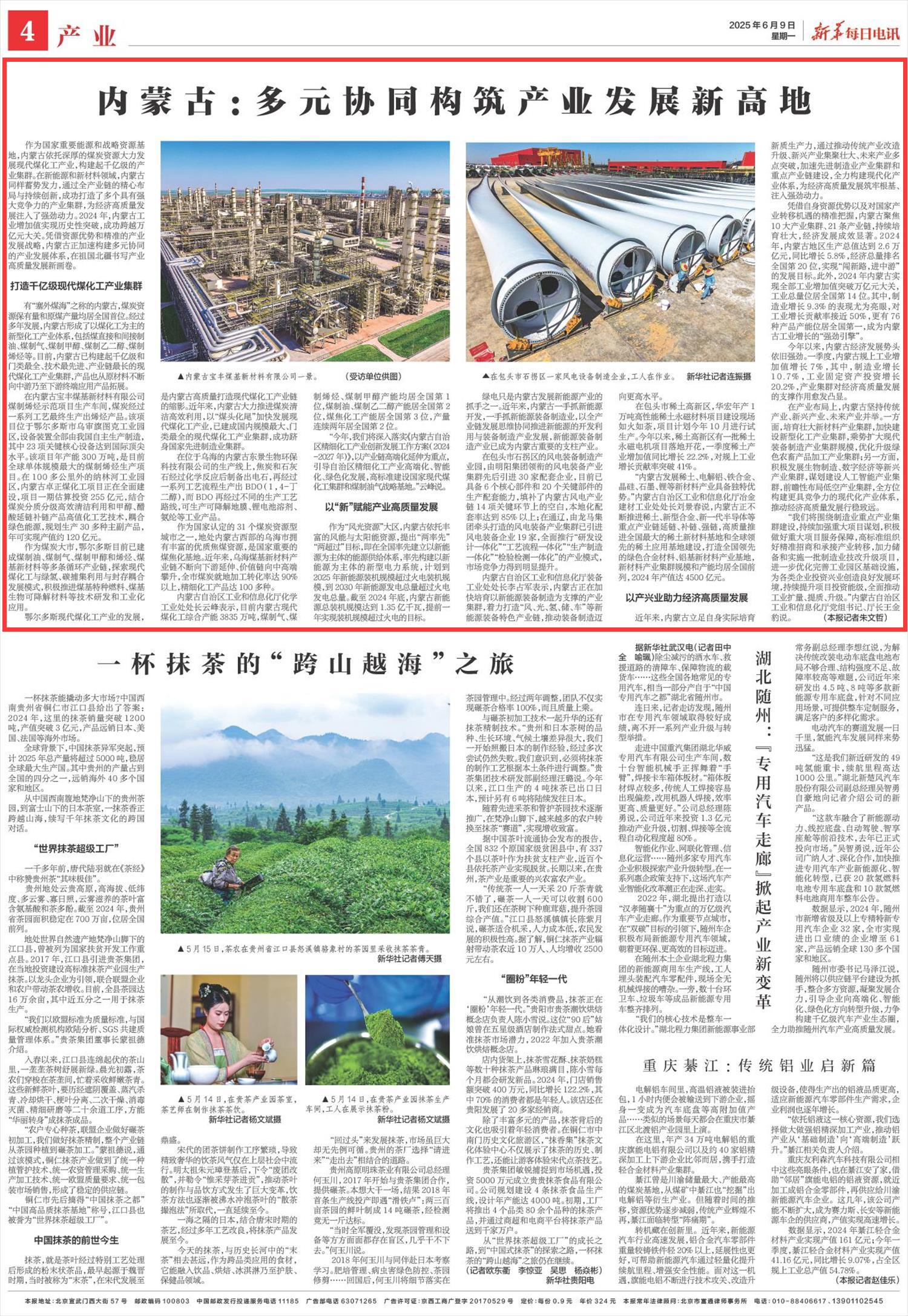 2025年6月9日《新華每日電訊》第4版刊發(fā)了《內蒙古:多元協(xié)同構筑產業(yè)發(fā)展新高地》的文章,報道了內蒙古依托深厚的煤炭資源大力發(fā)展現(xiàn)代煤化工產業(yè),構建起千億級的產業(yè)集群。憑借資源優(yōu)勢和精準的產業(yè)發(fā)展戰(zhàn)略,內蒙古正加速構建多元協(xié)同的產業(yè)發(fā)展體系,在祖國北疆書寫產業(yè)高質量發(fā)展新畫卷。