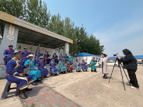 5月21日,記者走進(jìn)吐列毛杜鎮(zhèn)鐵特格嘎查,恰巧遇到鎮(zhèn)黨委宣傳委員高薩日娜正在拍攝最新一期的《村聞聯(lián)播》。嘎查小舞臺(tái)上,17名村民身著蒙古族服飾,手持四胡演奏著《烏力格爾三部曲》《牧民歌唱共產(chǎn)黨》等悠揚(yáng)的樂曲。他們大部分年齡都在五六十歲,來自當(dāng)?shù)氐睦ざ祭渌暮鷧f(xié)會(huì)。該協(xié)會(huì)共有60余名會(huì)員,多年來以四胡彈奏、科爾沁民歌、烏力格爾(一種蒙古族的曲藝說書形式)、好來寶說唱等各種方式,參與著吐列毛杜鎮(zhèn)文化志愿服務(wù)。