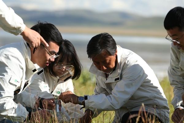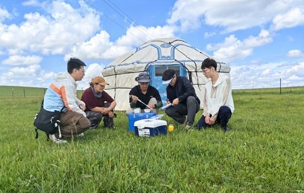 馬騰帶領團隊在內(nèi)蒙古錫林郭勒大草原采集自然發(fā)酵乳。左三為馬騰。受訪者供圖