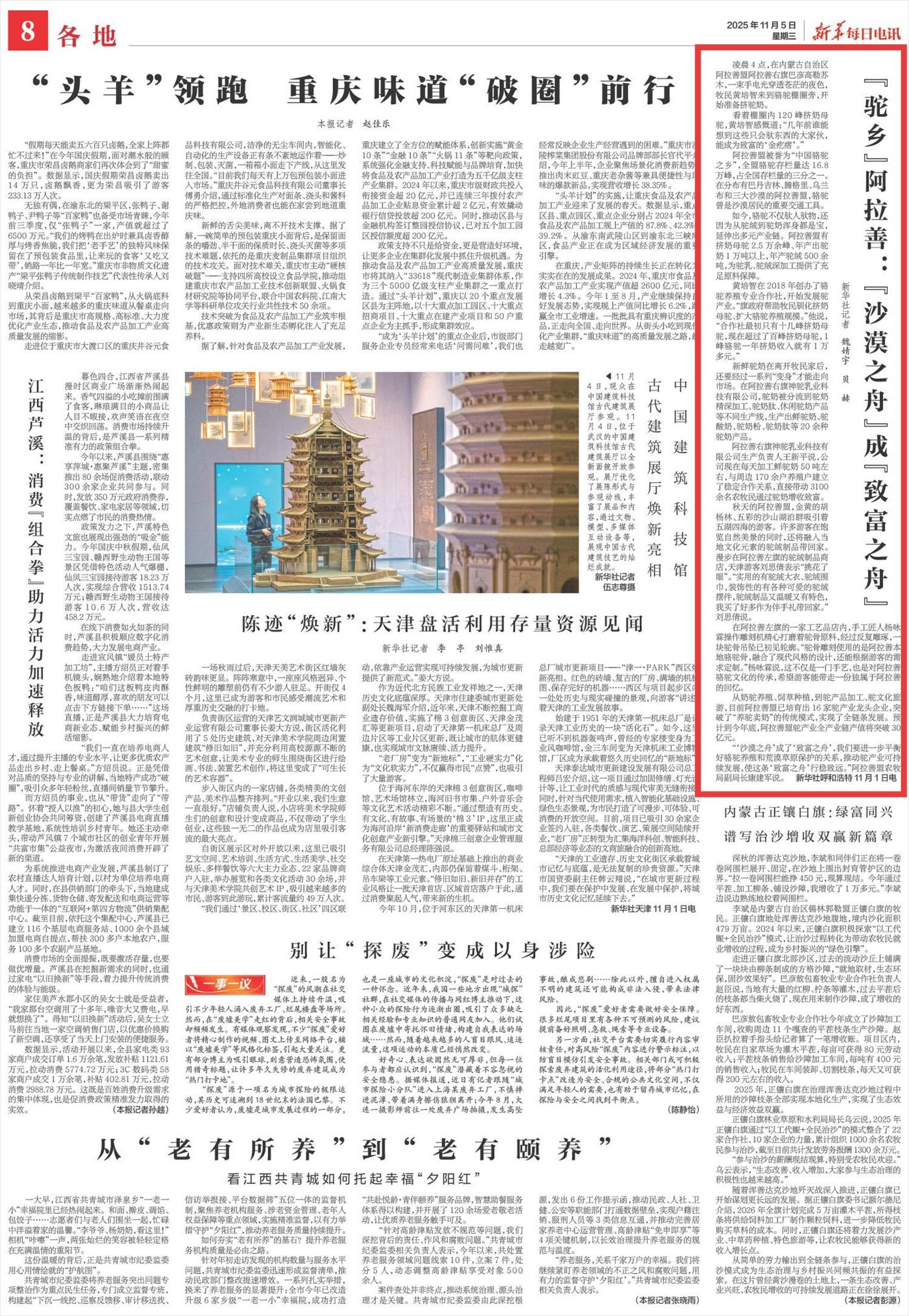 2025年11月5日,《新華每日電訊》第8版刊發(fā)題為《“駝鄉(xiāng)”阿拉善:“沙漠之舟”成“致富之舟”》的文章,報(bào)道了阿拉善盟被譽(yù)為“中國(guó)駱駝之鄉(xiāng)”,駱駝存欄量達(dá)16.8萬(wàn)峰,占全國(guó)存欄量的三分之一。預(yù)計(jì)到今年底,阿拉善盟駝產(chǎn)業(yè)全產(chǎn)業(yè)鏈產(chǎn)值將突破30億元。