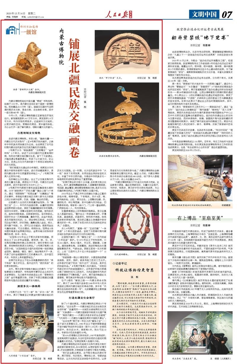 12月16日,《人民日報海外版》刊發(fā)《內(nèi)蒙古博物院 鋪展北疆民族交融畫卷》,報道內(nèi)蒙古自治區(qū)首個國家一級博物館今年6月搬遷至新館后開館試運(yùn)行。新館建筑面積14.7萬平方米,展覽面積3.9萬平方米,均為舊館的兩倍多。這座城市文化地標(biāo),以更開闊的空間、更精彩的展覽、更豐富的體驗(yàn),為公眾打開一扇了解內(nèi)蒙古、領(lǐng)略北疆文化的窗口。