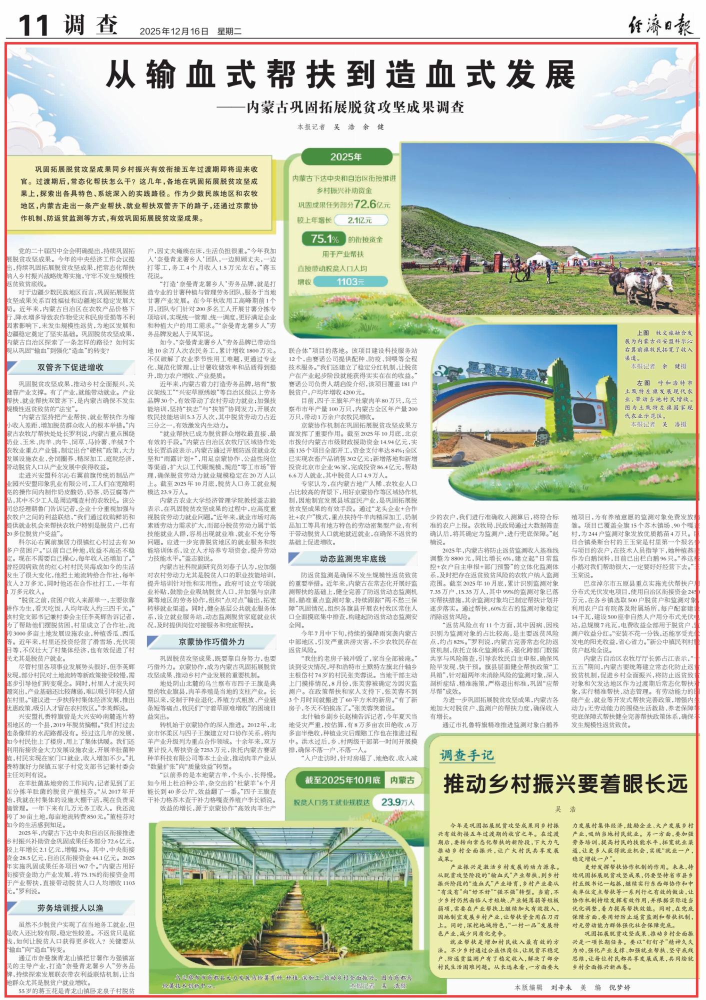 2025年12月16日,《經(jīng)濟(jì)日報》第11版刊發(fā)題為《從輸血式幫扶到造血式發(fā)展——內(nèi)蒙古鞏固拓展脫貧攻堅成果調(diào)查》的文章,報道了鞏固拓展脫貧攻堅成果同鄉(xiāng)村振興有效銜接五年過渡期即將迎來收官。作為少數(shù)民族地區(qū)和農(nóng)牧地區(qū),內(nèi)蒙古走出一條產(chǎn)業(yè)幫扶、就業(yè)幫扶雙管齊下的路子,還通過京蒙協(xié)作機(jī)制、防返貧監(jiān)測等方式,有效鞏固拓展脫貧攻堅成果。