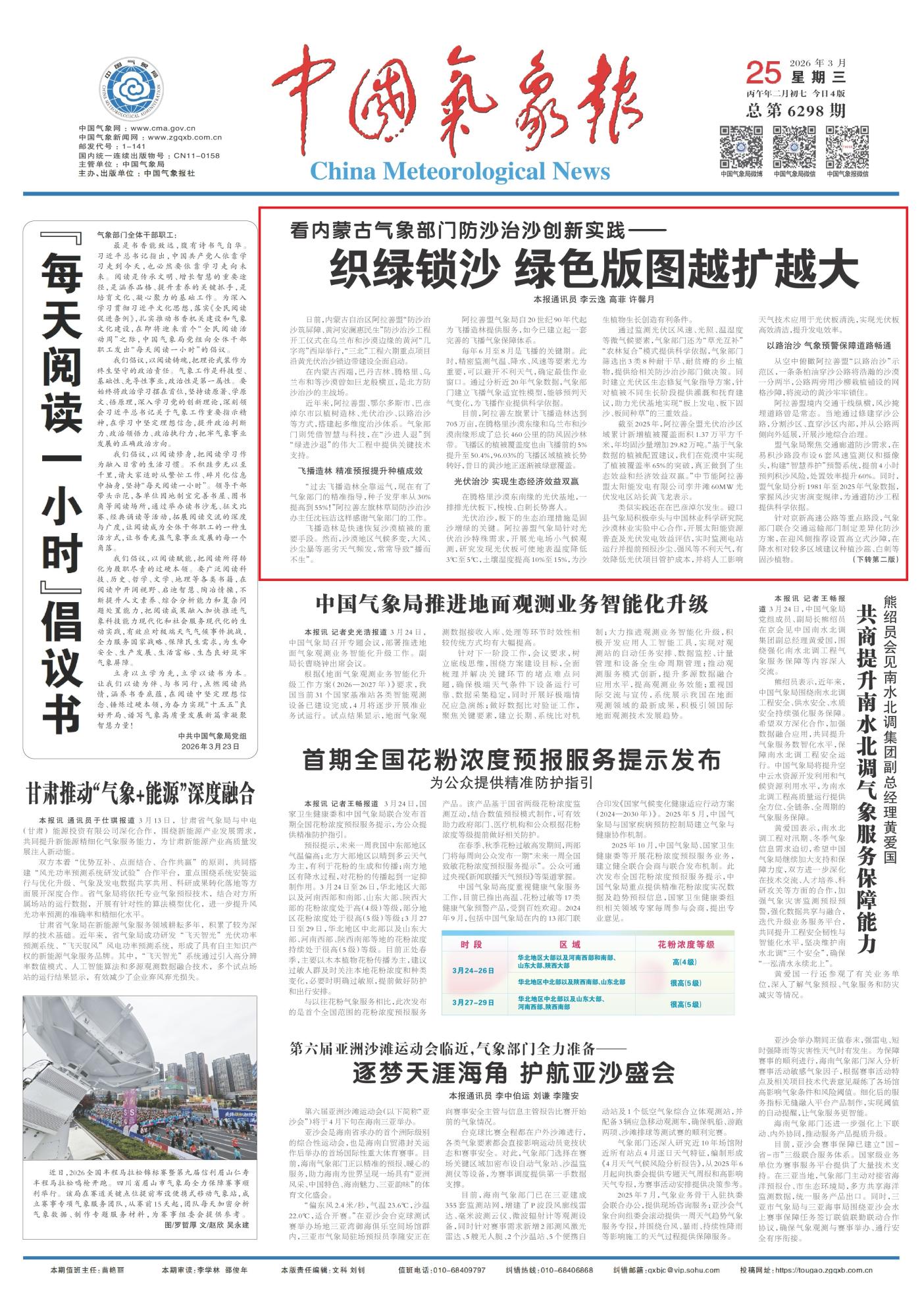 2026年3月25日《中國氣象報》第1版刊發(fā)了《看內(nèi)蒙古氣象部門防沙治沙創(chuàng)新實踐—織綠鎖沙綠色版圖越擴越大》的文章,報道了內(nèi)蒙古阿拉善盟啟動沿黃光伏治沙等“三北”六期防沙治沙重點工程,氣象部門精準賦能飛播造林、光伏治沙、以路治沙三大模式,提供全流程技術支撐,大幅提升治沙成效與生態(tài)經(jīng)濟效益,筑牢北方生態(tài)安全屏障。