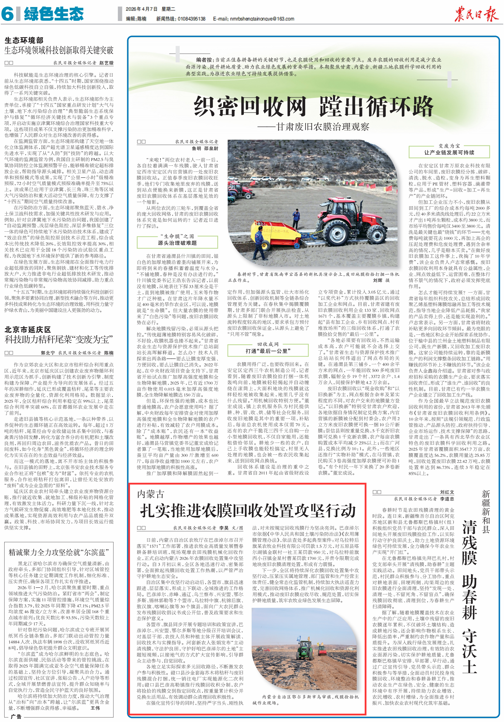 2026年4月7日,《農(nóng)民日?qǐng)?bào)》第6版刊發(fā)題為《內(nèi)蒙古扎實(shí)推進(jìn)農(nóng)膜回收處置攻堅(jiān)行動(dòng)》的文章,報(bào)道了日前,內(nèi)蒙古自治區(qū)農(nóng)牧廳在巴彥淖爾市召開落實(shí)“1571”工作部署、推進(jìn)農(nóng)牧業(yè)高質(zhì)量發(fā)展暨春耕備耕培訓(xùn)班,現(xiàn)場(chǎng)觀摩農(nóng)田殘膜機(jī)械化回收作業(yè),正式啟動(dòng)內(nèi)蒙古2026年農(nóng)膜回收處置集中攻堅(jiān)行動(dòng)。自3月初以來,全區(qū)各地迅速行動(dòng)、密集部署,全面掀起殘膜回收處置工作熱潮,以嚴(yán)管嚴(yán)治守護(hù)耕地生態(tài)安全。