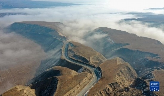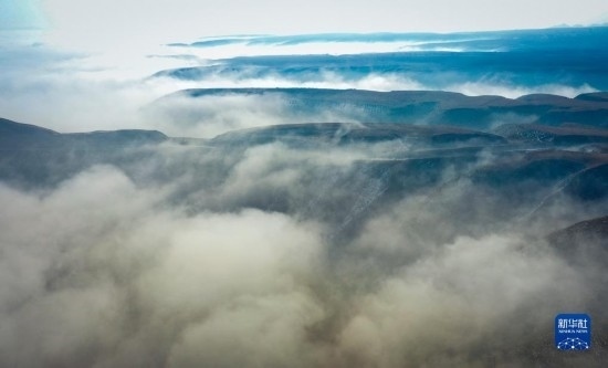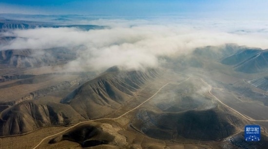 當(dāng)日,寧夏吳忠市同心縣的山谷間出現(xiàn)云海景觀,農(nóng)田、旱塬、公路在霧中若隱若現(xiàn),景色壯美。