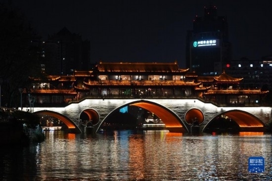 這是3月1日拍攝的成都市錦江安順廊橋夜景。