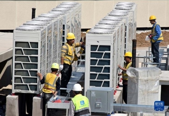 5月1日,在浙江省杭州市臨平區(qū)一個項目工地,中建三局的建設者在施工中。