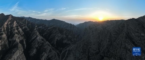 日落時分的內(nèi)蒙古賀蘭山國家級自然保護(hù)區(qū)(5月11日攝,無人機(jī)全景照片)。