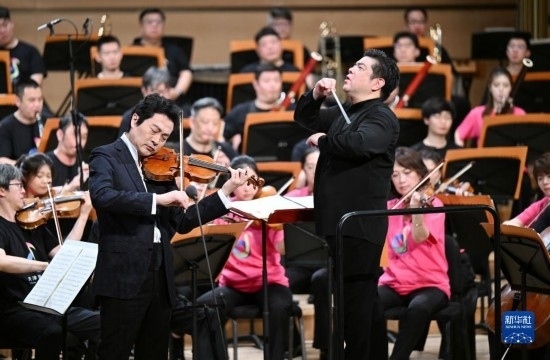 5月25日,在天津大劇院音樂(lè)廳,小提琴演奏家呂思清(左)和指揮李飚(右)在舞臺(tái)上演出。