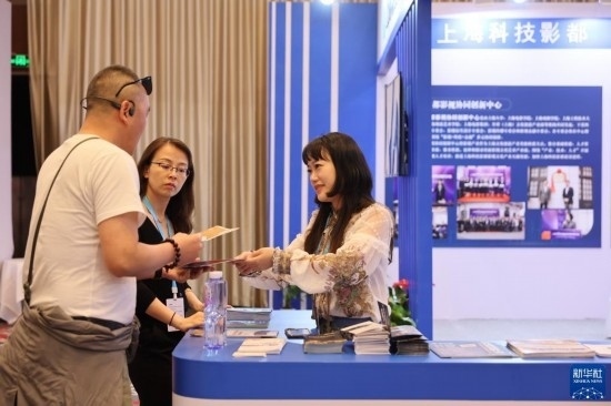 6月10日,展商在電影市場與咨詢者交換聯(lián)系方式。
