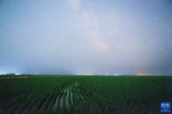 這是6月26日凌晨在黑龍江省富錦市萬畝水稻公園內(nèi)拍攝的稻田和星空(長(zhǎng)時(shí)間曝光)。