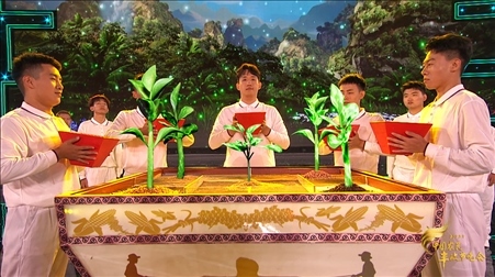 民以食為天,食以糧為先。2023年豐晚現(xiàn)場(chǎng),沿著五條金穗鋪展的“豐收大道”,五位育種專家將手捧五斗種子,把自主創(chuàng)新培育的棉花、小麥、玉米、花生、水稻種子,鄭重交給自己的學(xué)生,并和一批農(nóng)科大學(xué)新生代表共同完成一場(chǎng)別有深意的“中國(guó)種子傳承儀式”。種子最終被播入“五色土”,不僅種下代代傳承、年年豐收的美好心愿,更承載著一代又一代科研工作者不斷求索與接力、守護(hù)糧食安全的責(zé)任和使命。