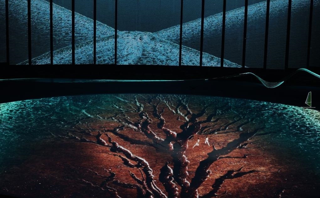吉祥物“江南憶”破水而出,騰躍而起?!皠悠饋怼钡摹扮薄吧徤彙薄板峰贰睆椬嗥饒A形的“水浪鋼琴”,激活了象征著數(shù)字賦能杭州城市建設(shè)的“芯片面板”。660根數(shù)控光源棒點亮“科技之潮”,AR虛擬半球狀的數(shù)字穹頂營造出震撼的立體空間。