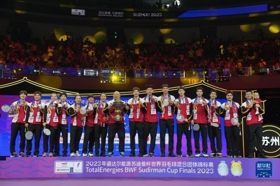 5月21日,2023年蘇迪曼杯世界羽毛球混合團(tuán)體錦標(biāo)賽頒獎儀式在江蘇省蘇州市舉行。中國隊在決賽中以3比0戰(zhàn)勝韓國隊,奪得冠軍。圖為中國隊在頒獎儀式上慶祝。新華社記者 杜宇 攝