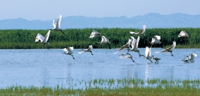 6月的烏梁素海,天藍水碧、湖面如鏡,綠色蘆葦隨風搖曳,鳳頭鸊鷉、赤麻鴨、白骨頂、綠頭鴨等或游弋湖中、或棲于葦蕩、或翱翔天空,一派自然和諧景象。