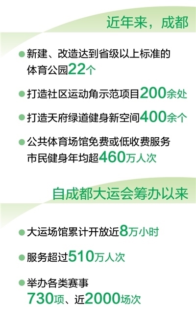 成都市體育局副局長陳志表示:“近年來,成都新建、改造達到省級以上標準的體育公園22個,打造社區(qū)運動角示范項目200余處、天府綠道健身新空間400余個,公共體育場館免費或低收費服務市民健身年均超460萬人次。”