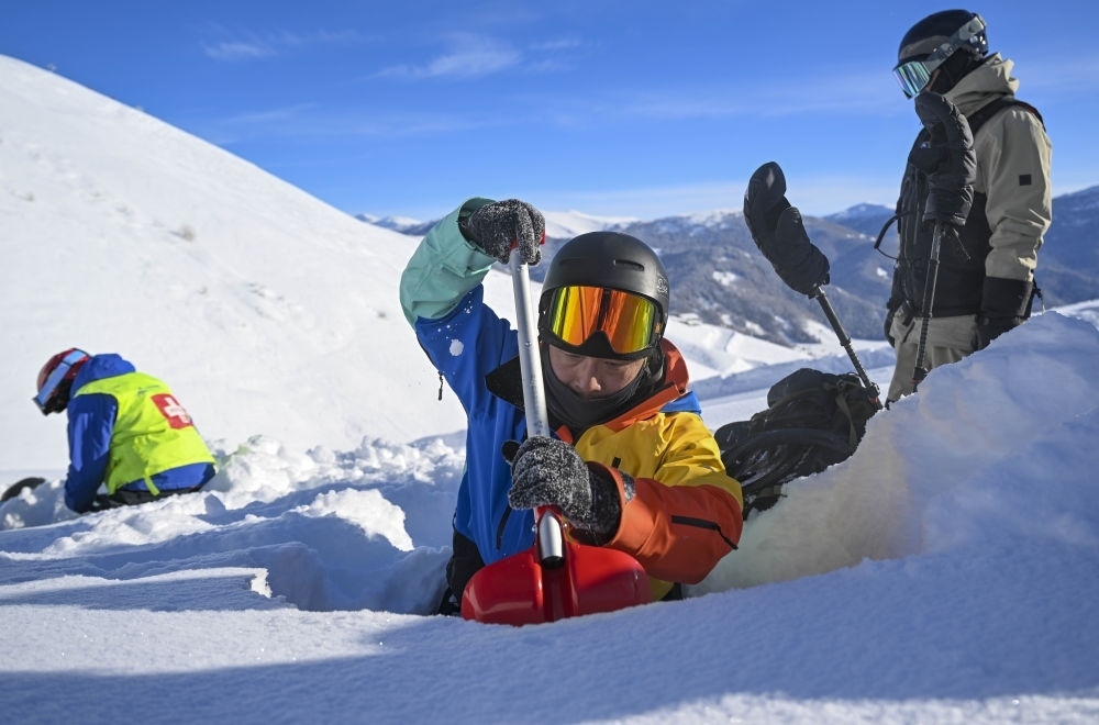 彭超(中)和新疆阿勒泰地區(qū)禾木吉克普林滑雪場(chǎng)救援隊(duì)一起做雪層分析,預(yù)判風(fēng)險(xiǎn)保障游客滑行安全。