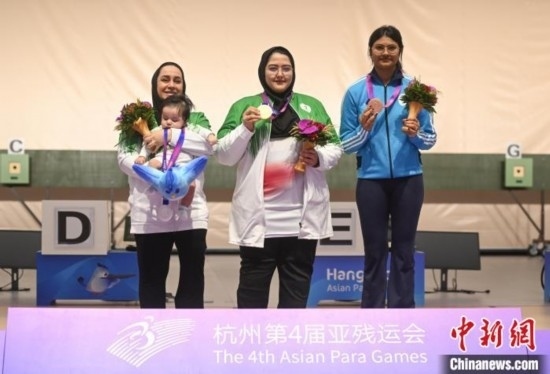 在SH1級女子10米氣手槍頒獎儀式中,伊朗選手薩雷赫抱著三個月大的兒子登上亞軍的領(lǐng)獎臺。與獎牌、花束一同呈上的,還有官方特意贈予小朋友的杭州第4屆亞殘運(yùn)會吉祥物“飛飛”玩偶。