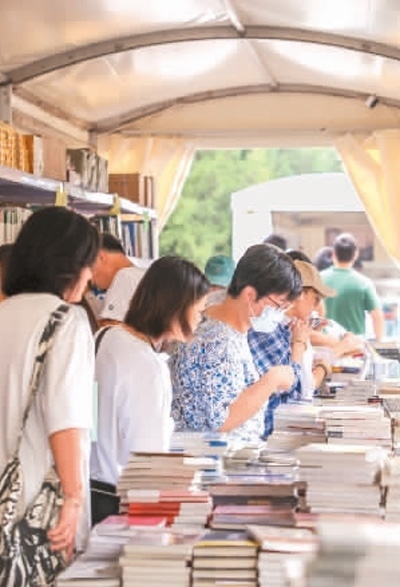 游客在2023“我與地壇”北京書(shū)市現(xiàn)場(chǎng)選購(gòu)書(shū)籍。本報(bào)記者 蔣雨師攝