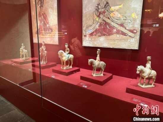 唐墓中的壁畫和彩色陶俑是唐代極具代表性的藝術珍品。記者在展廳看到,女性陶俑類型多樣,各種女坐俑、立俑、侍俑、樂舞俑、騎馬俑、貴婦俑……這些女俑造型生動,尤其是三彩女俑,釉色艷麗,呈現(xiàn)了唐代女性“千人千面”的生存狀態(tài)。